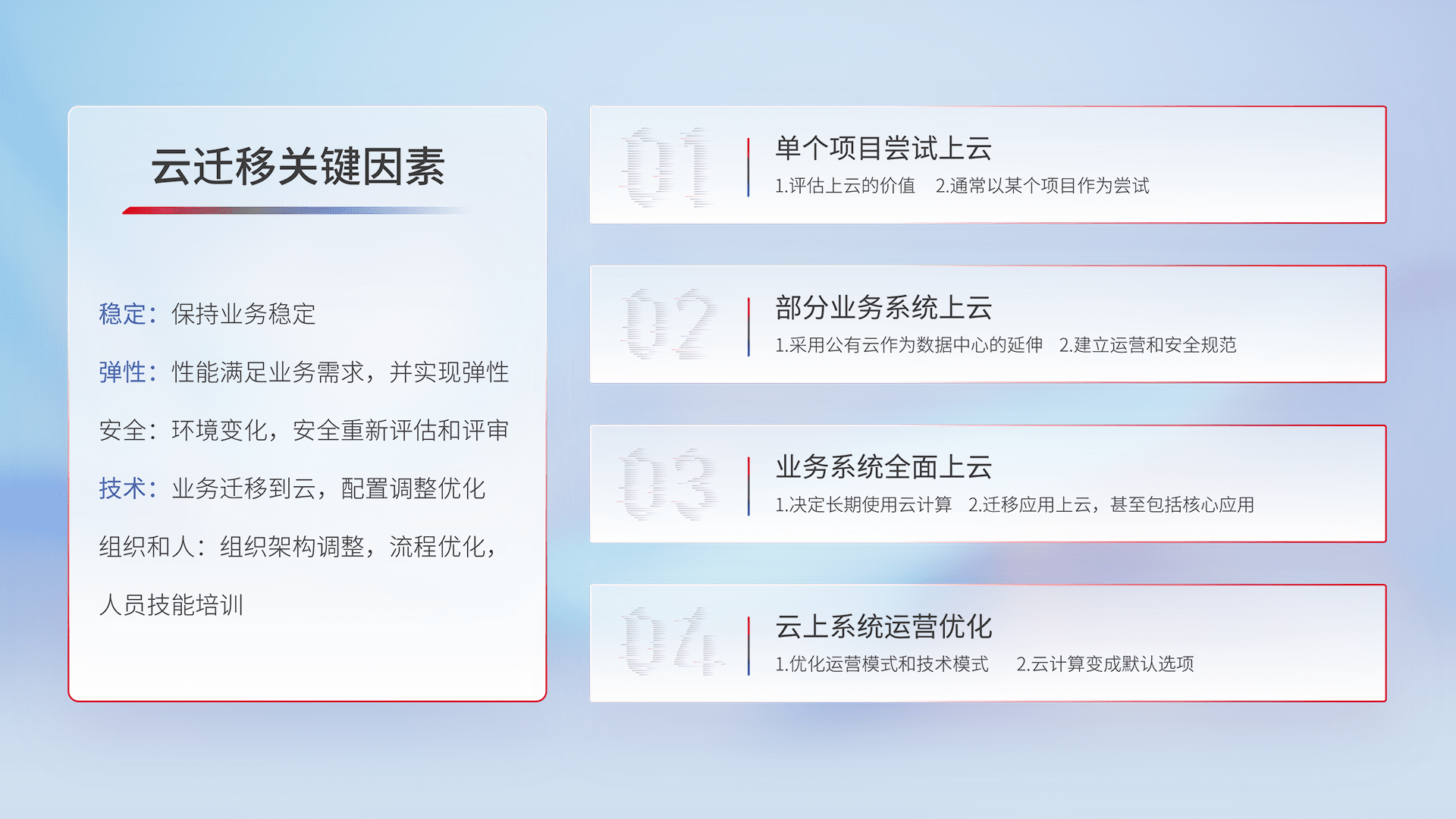 结合实际业务,,从规划设计、、、、云平台选型、、、、云原生改造、、数据迁移、、、、集成交付,,,迁移全过程为客户识别最佳上云路径,,,做好风险识别管理,,,,设计网络架构、、、身份权限、、、、安全审计合规、、操作审计、、、、日志审计、、、、监控告警策略、、多站点容灾设计等,,,,对云上基础设施进行整体规划,,提升IT治理水平,,,以满足弹性、、高可用、、、、高性能的需求。。。