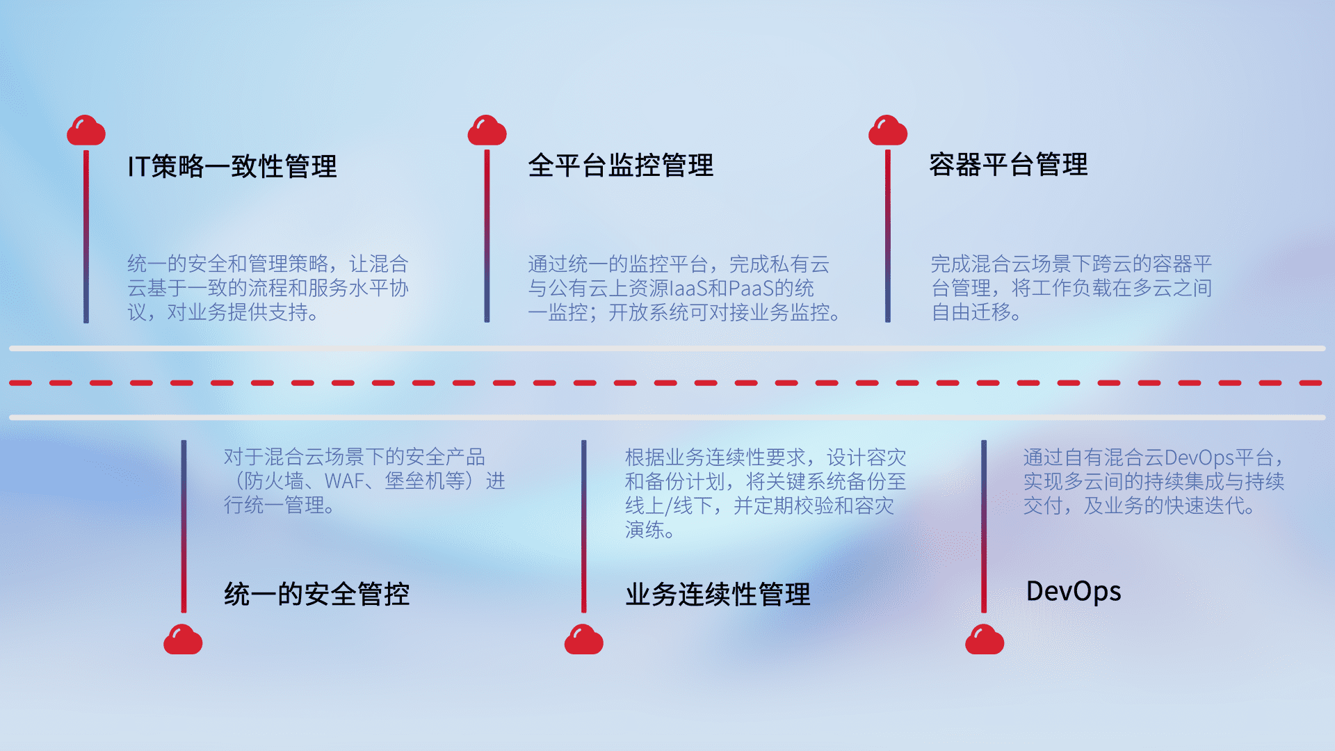 通过多云纳管,,,以统一的资源数据模型把客户的云资源进行抽象和封装,,进而实现对多云资源的统一操作,,,保障云资源管理的可靠性、、、稳定性与可用性。。。量身定制化运维内容,,,配置、、、开发运维、、、、补丁管理、、备份、、监控、、认证和访问管理、、、审计和日常巡检等,,,保障在用云过程中的可靠度,,,稳定度以及高可用率。。。。