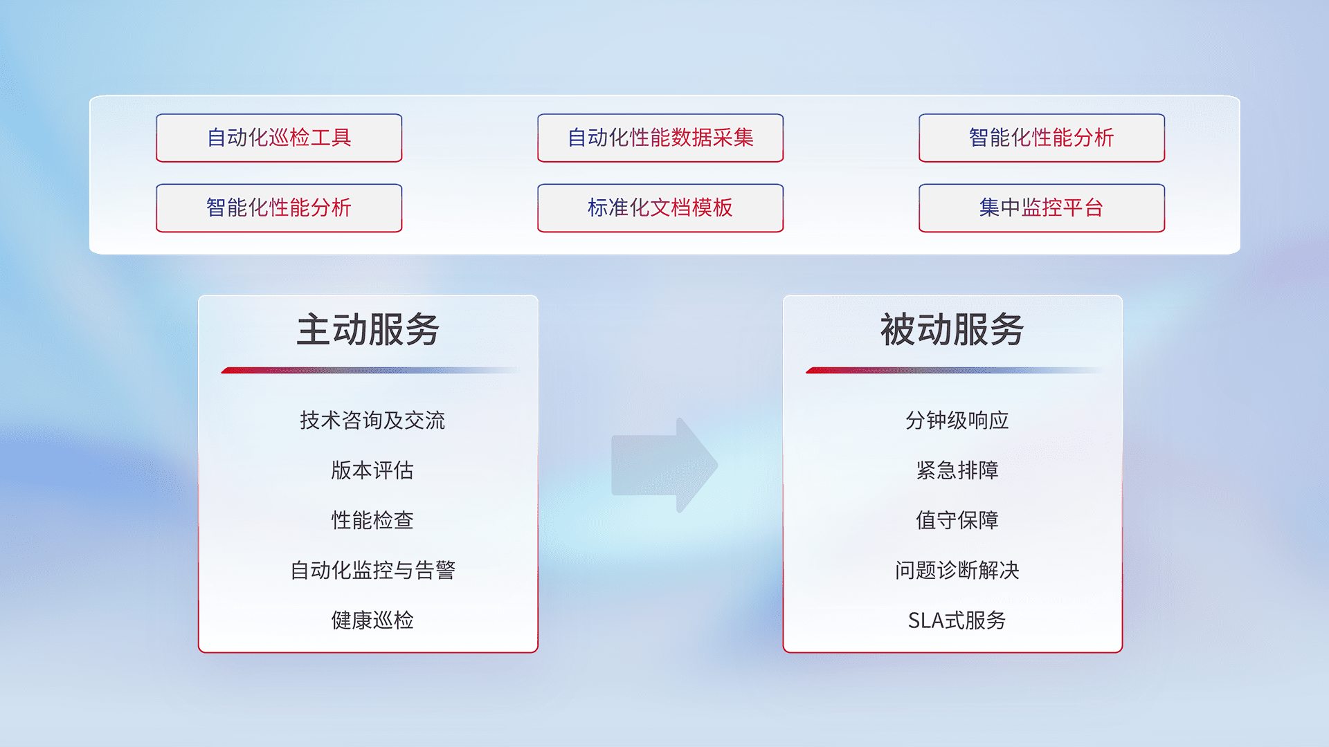 智能化工具和标准化文档,,,,保障服务质量,,提供主动服务(包含技术咨询、、、、版本评估、、性能检查、、自动化监控与告警、、、健康巡检)和被动服务包含(分钟级响应、、、、紧急排障、、、、值守保障、、问题诊断解决、、、SLA服务)。。